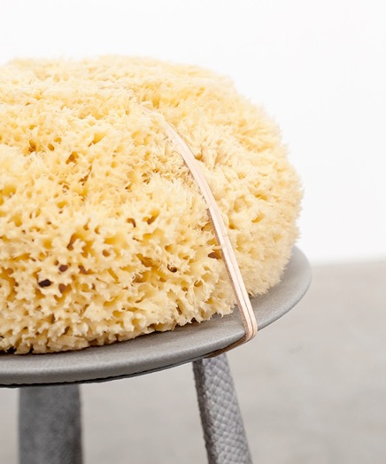 Salmon stool: Fendi discarded leather, vegetal tanned salmon skin, wood, sea sponge