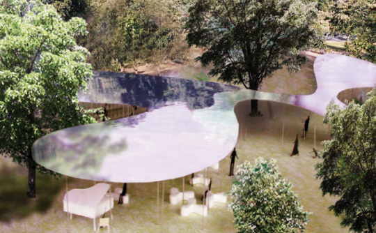 Their stunning design for this year’s Pavilion resembles a reflective cloud sitting atop a series of delicate columns. The metal roof structure varies in height, wrapping itself around the trees in the park, reaching up towards the sky and sweeping down almost to the ground in various places. Open and ephemeral in structure, its reflective materials make it sit seamlessly within the natural environment, reflecting both the park and sky around it.