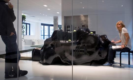Close-by, another mineral projection changes agency coffee breaks, this time from the sky and much higher, a black tar meteorite now serves as a bar. A strange and visually magnetic object, a small piece of interstellar virginity, this anti-design mass welcomes visitors for an onward journey towards creative horizons to be built. A place for fruit, objects or simply for leaning on or putting down coffee cups.