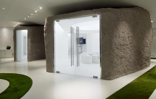 The second meaningful gesture, the agency’s specific digital sensibility is entirely embodied by the meeting room, transformed into a creative cavern with walls totally produced from paper fibres, "It has literally sucked up and recycled the available paper in the agency, an archaic and useless support that JWT France eventually envisages totally eliminating.’ Providing excellent soundproofing, usually used for thermal insulating in organic buildings, the final execution sublimates the irregular exterior surface, a shell whose spray projected neo-archaism contrasts with the milky and luminous purity of the internal shell: pure James Bond genius where the most unobtrusive rock hides Dr No’s ultra technical trace